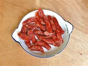 1. 蒸香肠:将晾晒好的香肠放入蒸锅中,蒸约30分钟,直到香肠熟透。